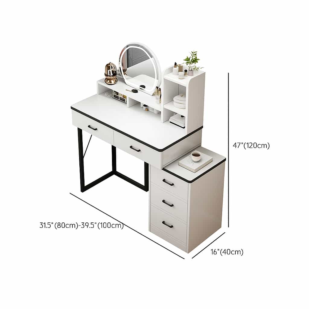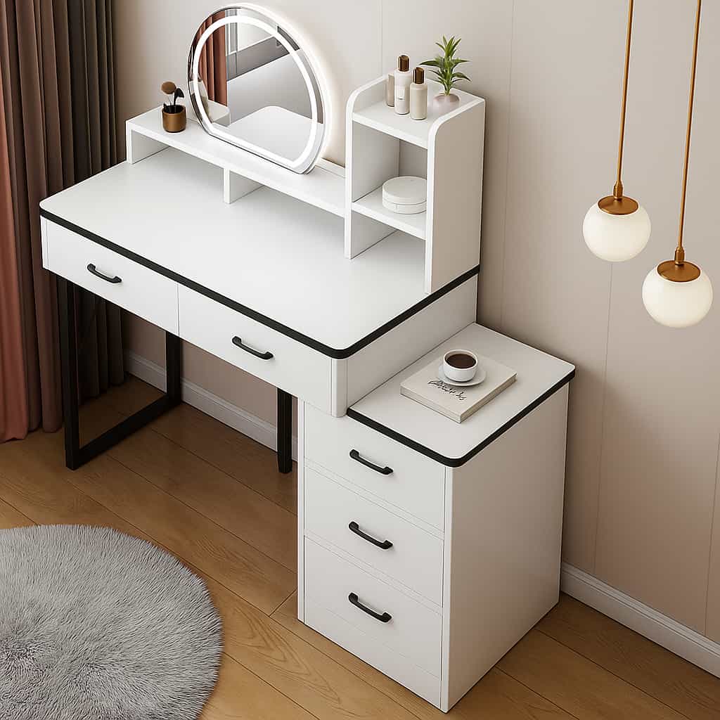 Tocador moderno con espejo LED integrado, ideal para dormitorios o espacios de belleza. Su diseño funcional combina líneas limpias con un acabado elegante en blanco brillante y detalles en negro, aportando un estilo contemporáneo y sofisticado. Ofrece amplia superficie para maquillaje, cuidado personal o decoración, junto con múltiples cajones para mantener todo perfectamente organizado.