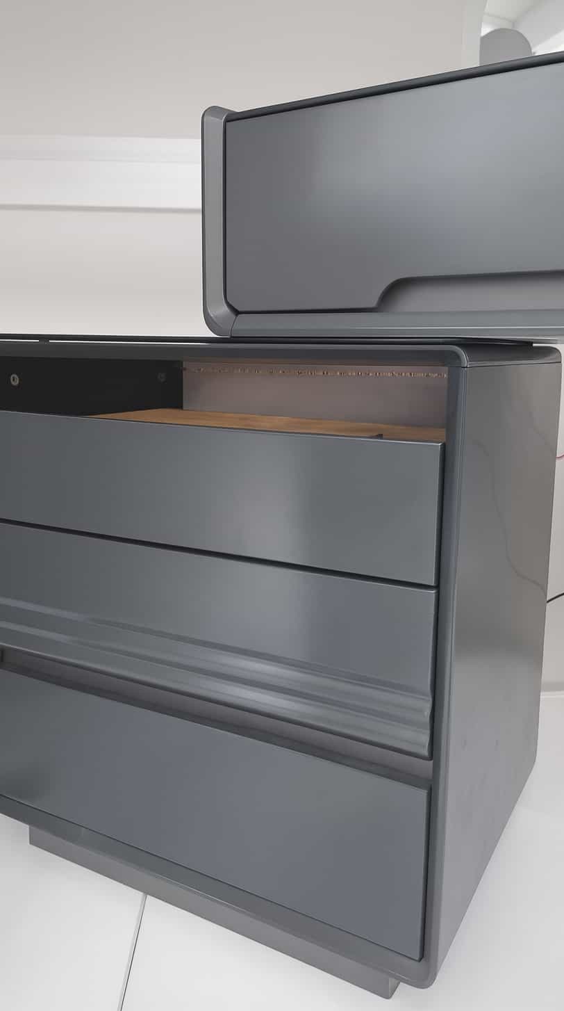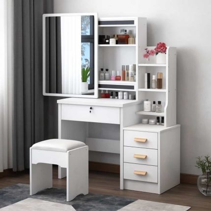 Tocador moderno en acabado negro con un diseño minimalista y elegante, ideal para dormitorios u espacios que buscan una pieza contemporánea y funcional. La superficie superior presenta un acabado texturizado que aporta resistencia y un estilo refinado. El módulo lateral incorpora tres gavetas amplias con interior en madera clara, perfectas para organizar maquillaje, accesorios o artículos personales. En la parte superior, el mueble incluye dos gavetas delgadas de acceso rápido integradas discretamente en la estructura. El espejo circular con marco delgado complementa el conjunto, creando un tocador equilibrado, práctico y visualmente sofisticado.