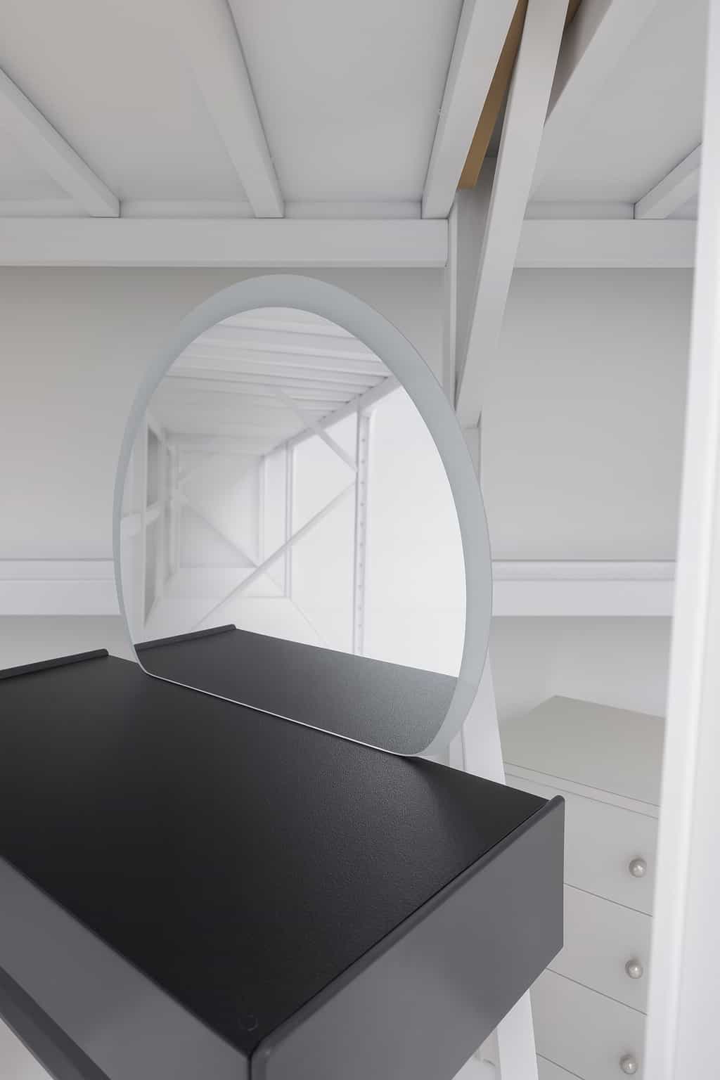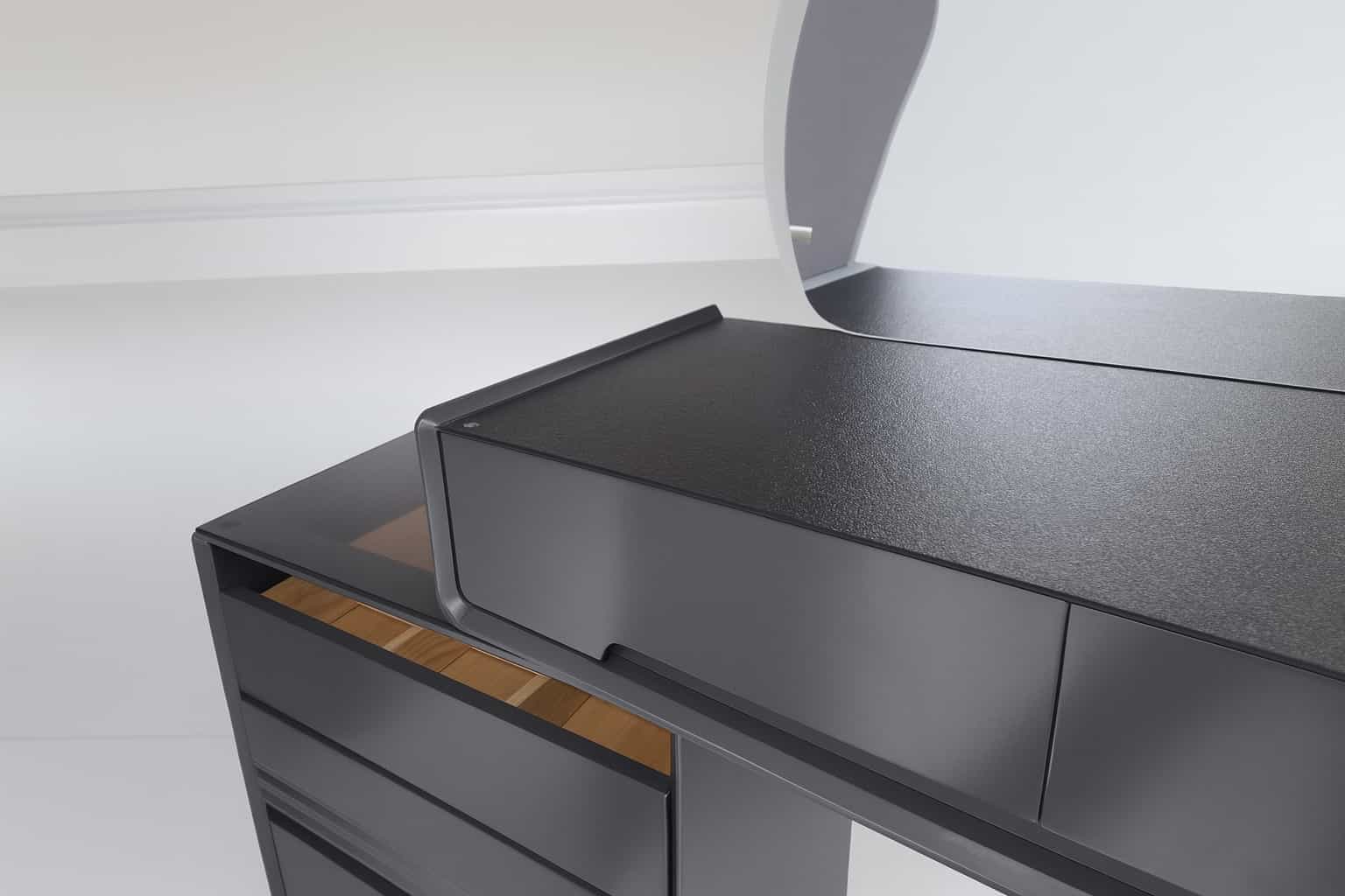 Tocador negro minimalista con gavetas amplias y espejo circular, ideal para maquillaje y organización con un estilo moderno y elegante.
