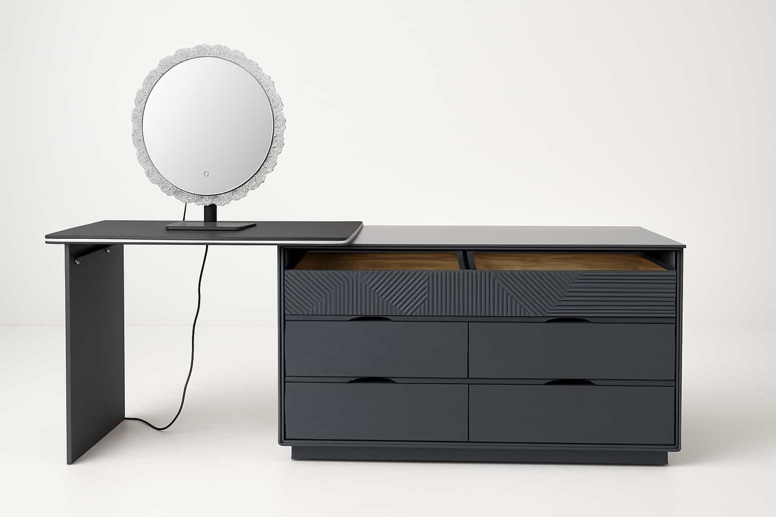 Tocador moderno en acabado negro con un diseño contemporáneo que aporta elegancia y funcionalidad a cualquier espacio. La superficie superior cuenta con un acabado texturizado que brinda resistencia y un aspecto sofisticado, ideal para colocar maquillaje, accesorios o elementos decorativos. El módulo lateral incorpora seis gavetas amplias de líneas rectas, con detalles frontales en relieve geométrico en las gavetas superiores, añadiendo un toque distintivo sin perder la estética minimalista. Las gavetas superiores incluyen organizadores internos en madera clara, perfectos para mantener cosméticos y accesorios pequeños bien clasificados. El espejo circular independiente complementa el conjunto y aporta versatilidad en su uso.