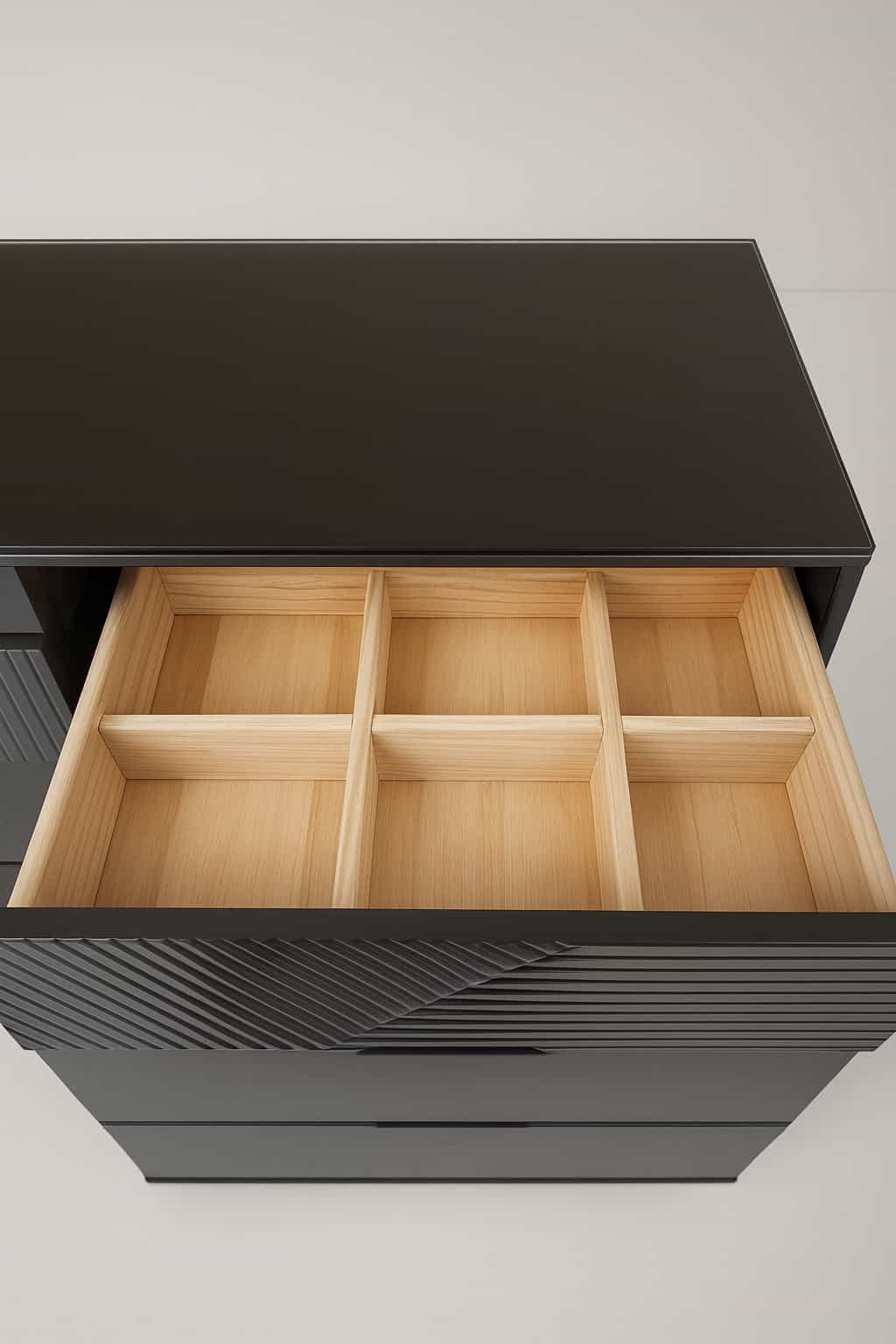 Tocador negro moderno con seis gavetas, detalles geométricos y organizadores internos, ideal para maquillaje y organización con un estilo elegante y contemporáneo.
