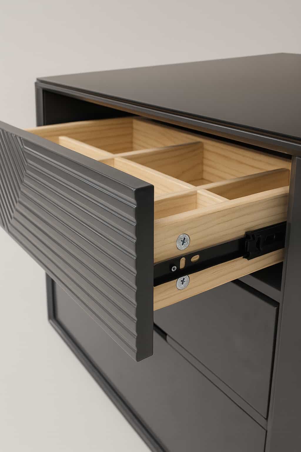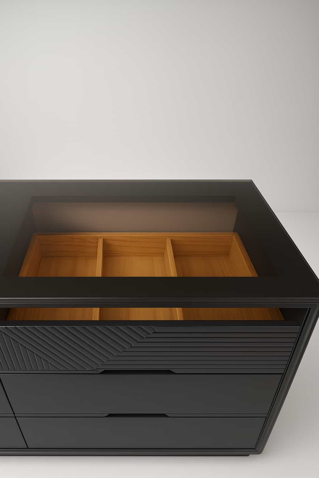 Relieve geométrico en las gavetas superiores.