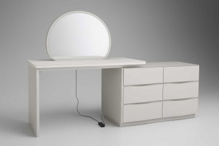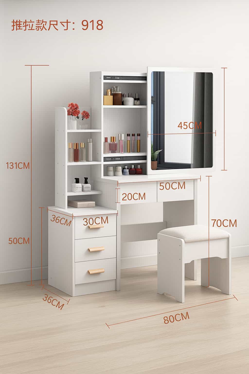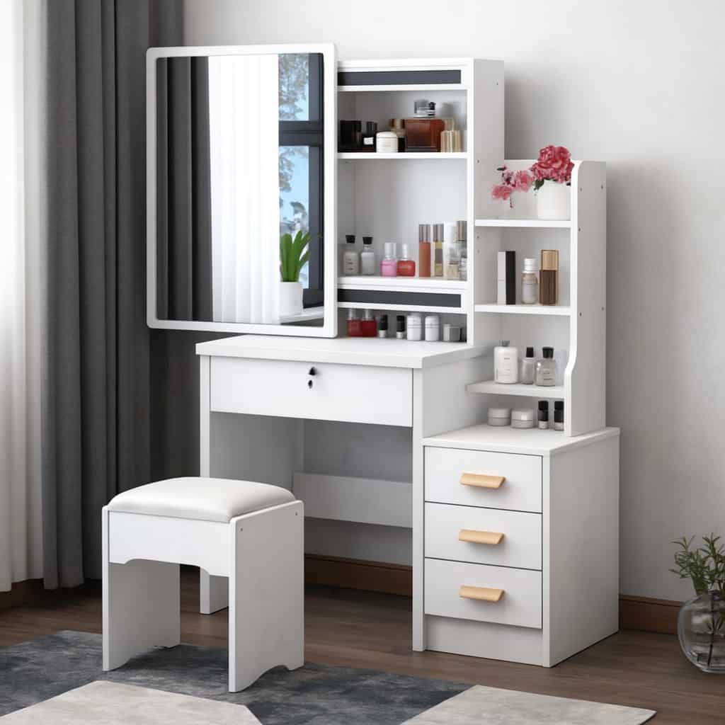 Tocador multifuncional en acabado blanco y rosado, diseñado para ofrecer amplio almacenamiento y una organización eficiente de maquillaje y accesorios. Su espejo rectangular de gran tamaño proporciona una excelente visibilidad y realza la estética moderna del conjunto. En la parte superior incorpora múltiples repisas abiertas para perfumes, cremas, esmaltes y productos de uso diario. La mesa central cuenta con una gaveta con cerradura para mayor seguridad, mientras que el módulo lateral ofrece tres gavetas amplias con tiradores en tono madera clara, aportando un detalle decorativo y cálido. Incluye una banqueta acolchada que complementa el diseño y brinda comodidad. Es un tocador ideal para espacios compactos que requieren funcionalidad y estilo.