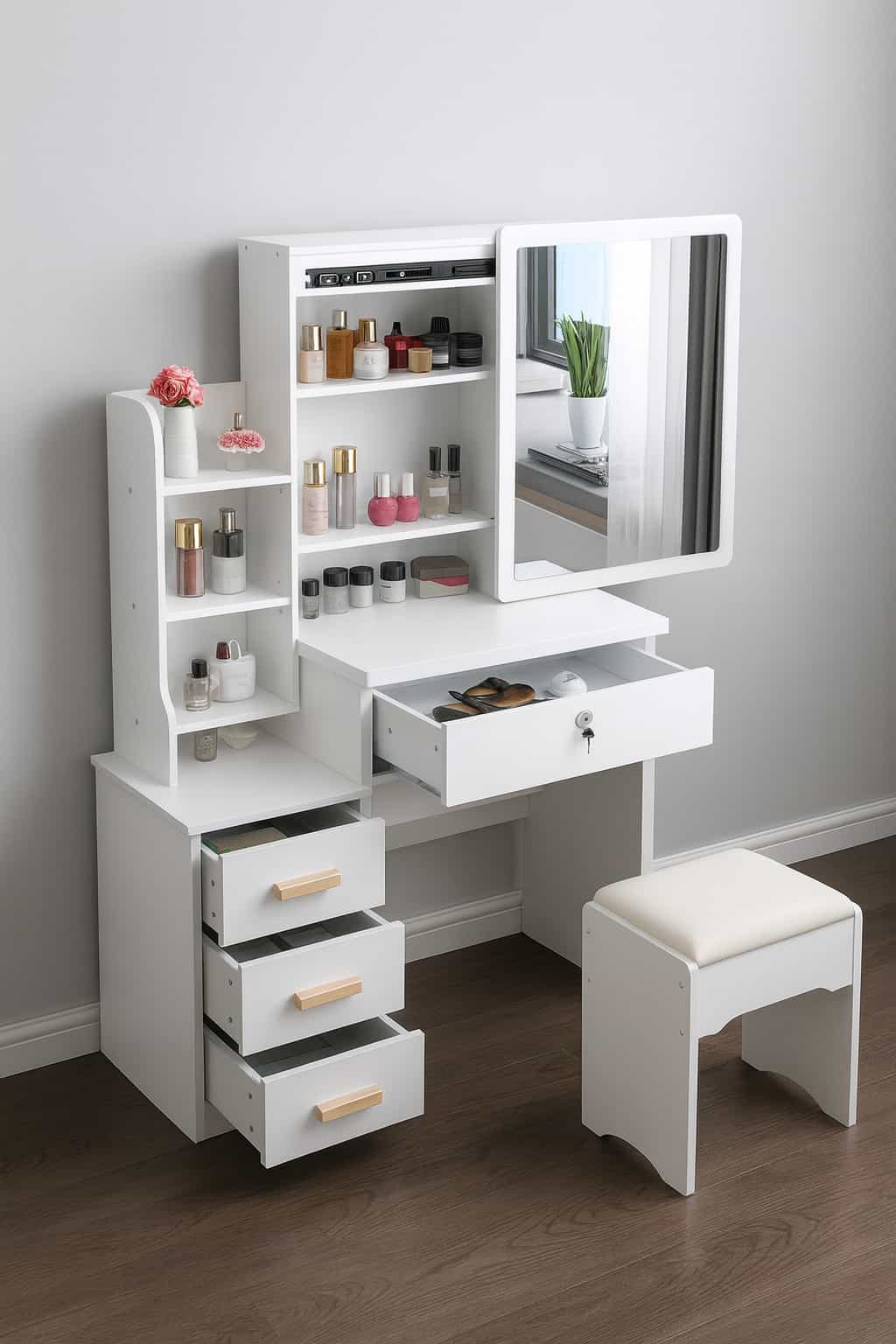 Tocador blanco y rosado con espejo amplio, repisas múltiples y gavetas laterales, ideal para organizar maquillaje y accesorios con estilo moderno y funcional.