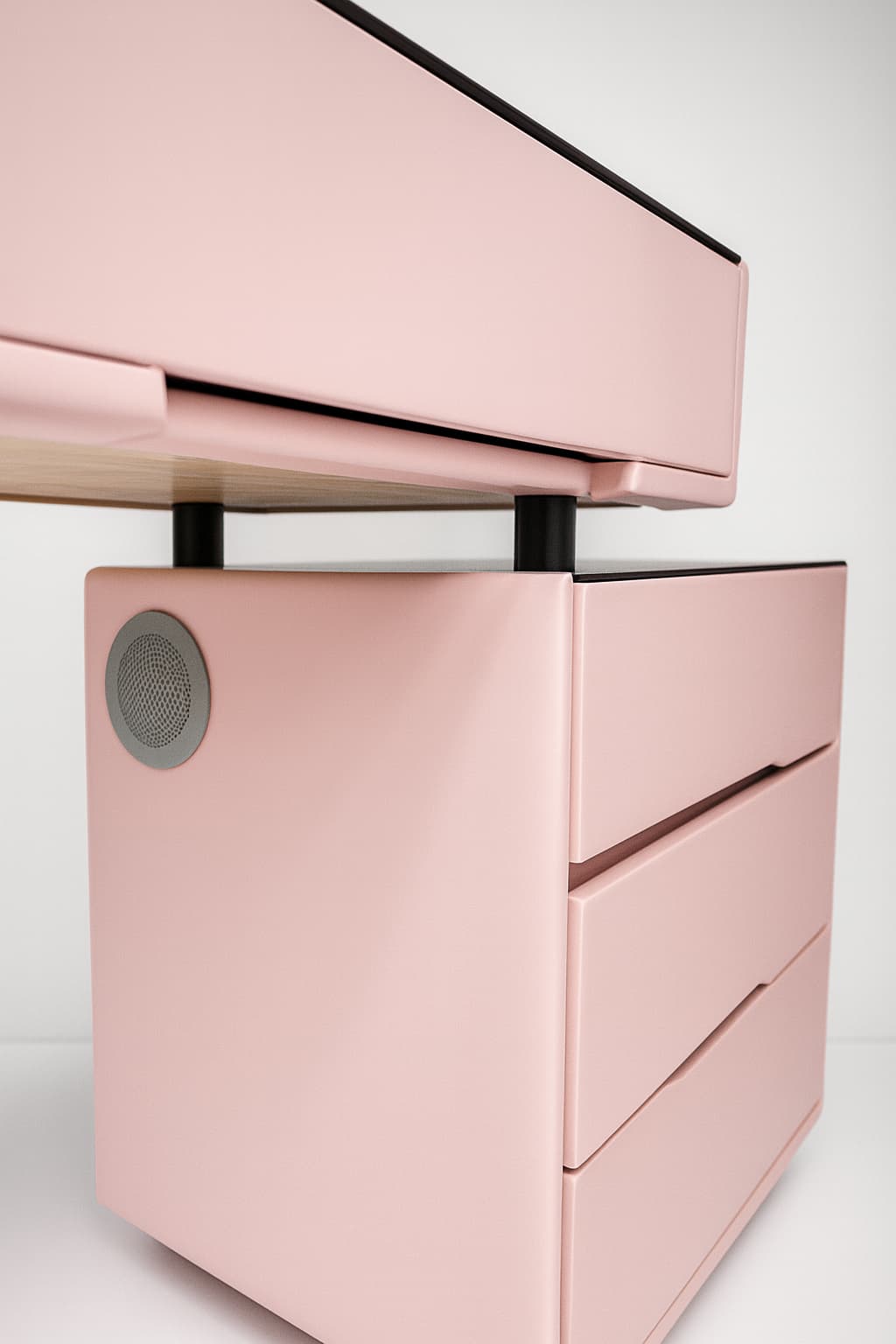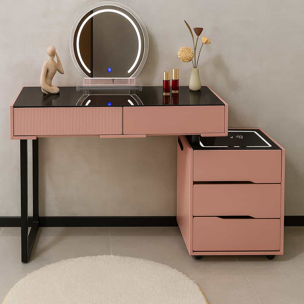 Tocador moderno con diseño minimalista en tonos rosa pastel y negro, ideal para dormitorios, estudios o áreas de maquillaje que buscan funcionalidad y estilo. Su cubierta superior negra de acabado liso aporta un contraste elegante, mientras que su estructura rosa brinda un aspecto suave y decorativo. Incluye un módulo lateral con tres gavetas espaciosas y compartimentos frontales delgados para mantener accesorios, maquillaje o artículos de uso diario siempre organizados. Su diseño limpio y contemporáneo lo convierte en una pieza versátil para cualquier ambiente.