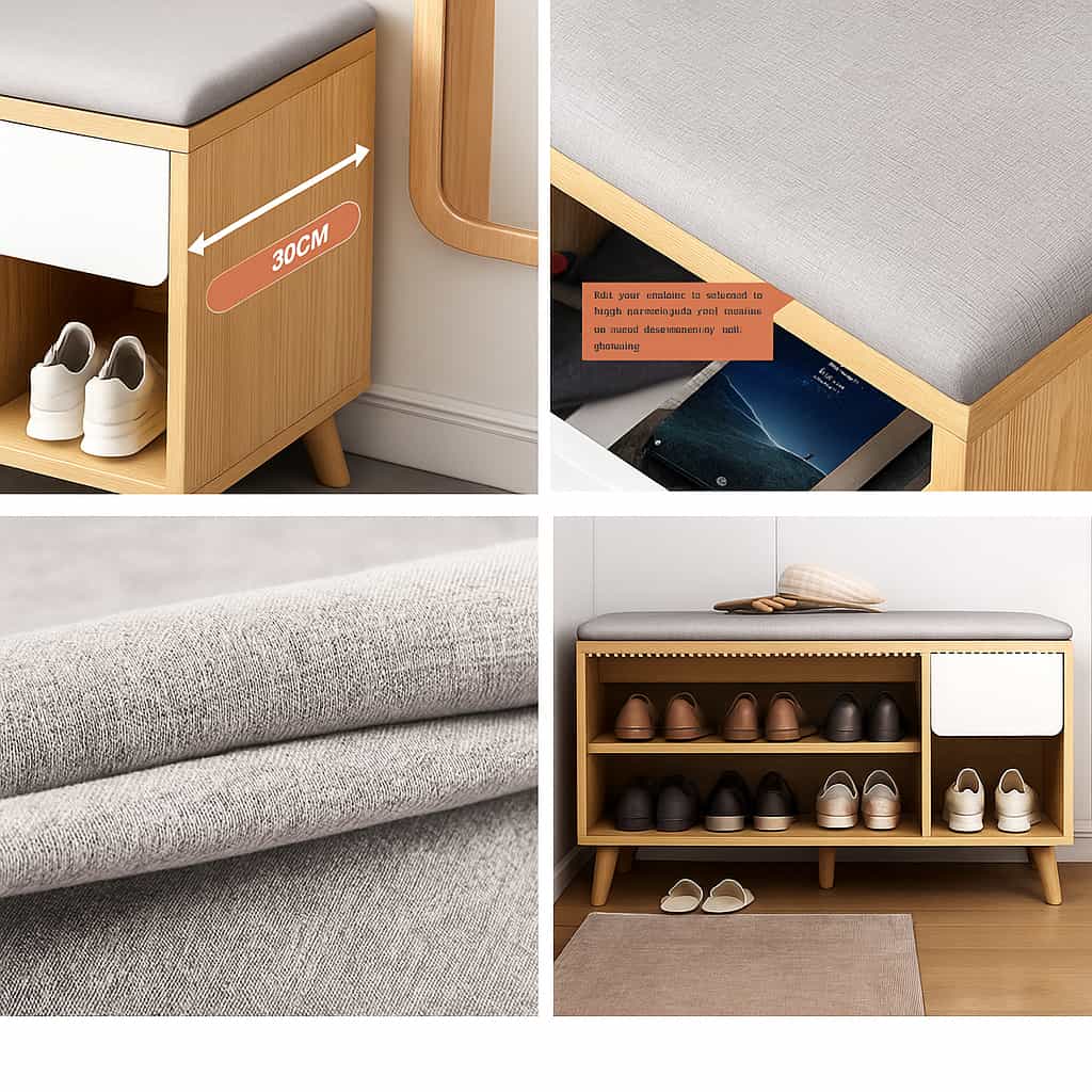 Zapatera multifuncional con asiento acolchado, diseñada para brindar comodidad y orden en la entrada o vestíbulo del hogar. Su estructura combina un estilo escandinavo con tonos cálidos de madera clara, aportando naturalidad y elegancia al espacio. Incluye compartimientos abiertos para organizar el calzado y un cajón lateral para guardar objetos pequeños o accesorios.